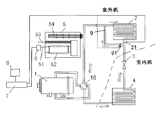 本發(fā)明公開了一種制冷、制熱的雙能源燃氣熱泵空調(diào)系統(tǒng)及運行方法,包括熱泵系統(tǒng),還包括一真空鍋爐換熱裝置、一溫度傳感器、以及一切換電路;真空鍋爐換熱裝置設置在室外,通過管道連接在熱泵系統(tǒng)的壓縮機和第一熱交換器之間,與其他部件處于同一循環(huán)系統(tǒng)中;溫度傳感器設置在室外,該溫度傳感器的輸出端與切換電路的輸入端電連接;切換電路根據(jù)溫度傳感器輸出的溫度信號控制真空鍋爐換熱裝置和第一熱交換器的交替啟閉。當室外溫度降到設定溫度以下時,真空鍋爐裝置制熱,從而徹底解決了普通熱泵系統(tǒng)在冬天低氣溫的時候室外機從空氣中吸熱效率低下、以及結霜導致系統(tǒng)無法運行的問題。具有效率高、制熱效果好和降低用電高峰時電力系統(tǒng)的壓力的優(yōu)點。 |