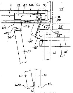 | 25 | 實用新型 | 門的開關機構 | 本發(fā)明提供可以把折疊式門打開大于90度角的門的開關機構。柜體(10)形成的開門部位至少有要開關一部分的相鄰的兩扇門A1、A2,以上下方向的第1軸S1為中心連結在一起,并可以相互轉(zhuǎn)動,一扇門A1具有以遠離上述第1軸一側A1R附近上下方向的第2軸S2為中心與柜體連結,并能相對柜體轉(zhuǎn)動的折疊式門A,以及沿柜體開口部位左右方向移動的移動件12,以上下方向的第3軸S3為中心與上述移動件連結,并能相對上述移動件轉(zhuǎn)動的轉(zhuǎn)動部件14A、14B。上述折疊式門的另一扇門A2以在遠離上述第1軸一側A2L附近的第4軸S4為中心,連結上述轉(zhuǎn)動部件,并可以相互轉(zhuǎn)動。 |