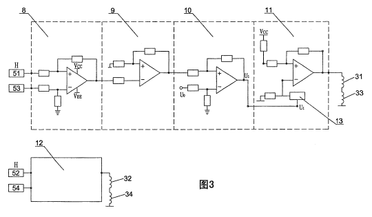 而涉案專利說明書給出了唯一的“具體實(shí)施方式”,即:懸浮體水平運(yùn)動(dòng)控制裝置包括:①帶鐵芯的四個(gè)線圈31、32、33、34;②四個(gè)霍爾元件傳感器(磁性傳感器)51、52、53、54,分成兩組分別控制兩組線圈,進(jìn)而控制懸浮體X、Y方向的自由移動(dòng);③在底座內(nèi)還設(shè)置有控制電路板6,由完全相同的相對獨(dú)立的控制電路12組成;④控制電路12也僅僅給出一個(gè)具體實(shí)施方式,即傳感器電壓接入減法電路8(檢測電壓值),經(jīng)放大電路9(信號(hào)放大),與減法電路10的基準(zhǔn)電壓U0進(jìn)行比較,輸出到功放電路;當(dāng)輸出電壓不為0時(shí),進(jìn)行勵(lì)磁電流的調(diào)整。如下圖: