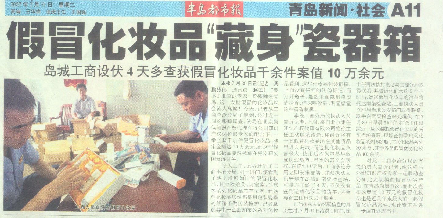 青島市李滄工商分局的執(zhí)法人員稱,案發(fā)的前一周,來自北京集佳知識產(chǎn)權(quán)代理有限公司的保護部主任主動聯(lián)系到他們,稱近期將有一批假冒化妝品混在其他貨品里進入青島,而這批化妝品危害極大,使用后不僅容易導致皮膚過敏等,嚴重的甚至會毀容。在接到電話后,青島市工商李滄分局立即安排部署,并派執(zhí)法人員守候在島城的南渠檢查站,可接連守候了4天,不僅沒有查到運載化妝品的貨車,甚至與集佳也失去了聯(lián)系。