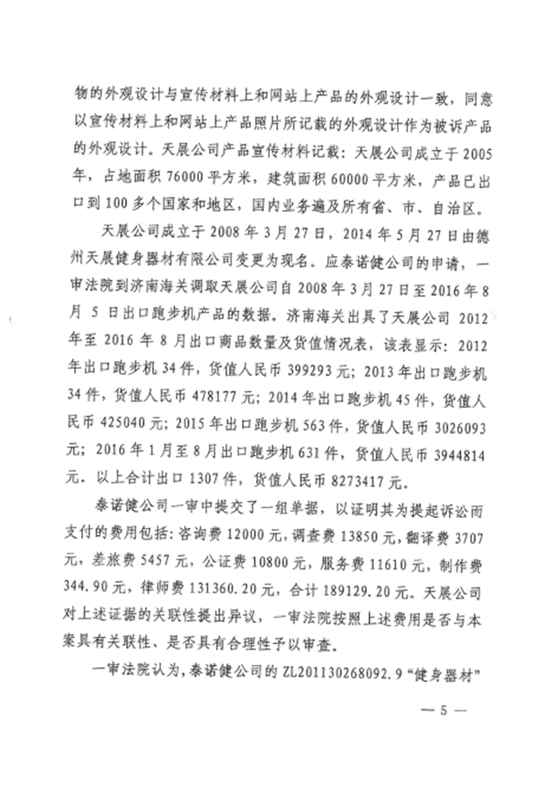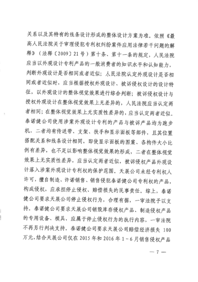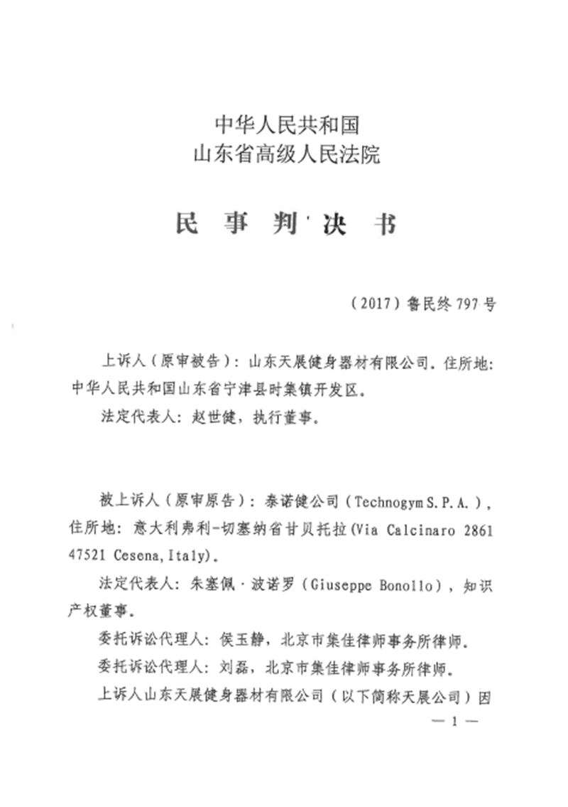 集佳代理意大利泰諾健公司訴山東天展健身器材有限公司(以下簡(jiǎn)稱(chēng)“天展公司”)侵害外觀設(shè)計(jì)專(zhuān)利權(quán)糾紛一案,經(jīng)濟(jì)南中院一審((2016)魯民初1656號(hào))、山東高院二審((2017)魯民終797號(hào)),我們已于近日收到由山東高院做出的終審判決。山東高院駁回被告上訴,維持一審判決,認(rèn)定被告天展公司生產(chǎn)、銷(xiāo)售、許諾銷(xiāo)售的被控侵權(quán)跑步機(jī)產(chǎn)品落入涉案專(zhuān)利權(quán)保護(hù)范圍,并支持了原告泰諾健公司主張的停止侵權(quán)行為、賠償經(jīng)濟(jì)損失及合理維權(quán)費(fèi)用等請(qǐng)求。