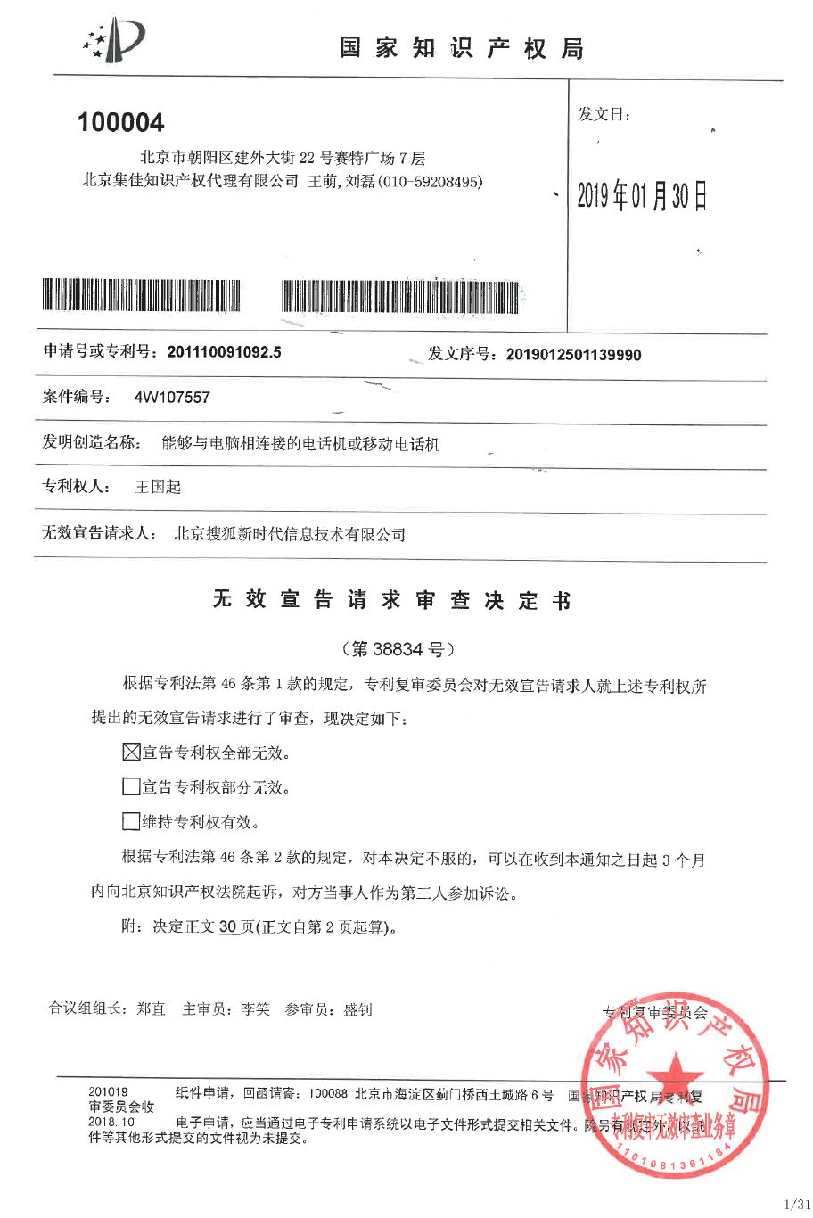 由于存在諸多特殊性,本案受到行業(yè)的高度關(guān)注。集佳公司接受搜狐公司委托,組建經(jīng)驗豐富的專利無效團隊,團隊成員深知該案的重要性,以高標準嚴要求的態(tài)度認真對待無效過程中的每個環(huán)節(jié),從前期對比文件檢索,到無效請求材料的準備,證據(jù)的補充,以及后期的口頭審理,承委托人之信任,擔盡力成事之責任,終于實現(xiàn)了委托人搜狐的期望,在新年來臨之前,收到復(fù)審委做出的無效決定。